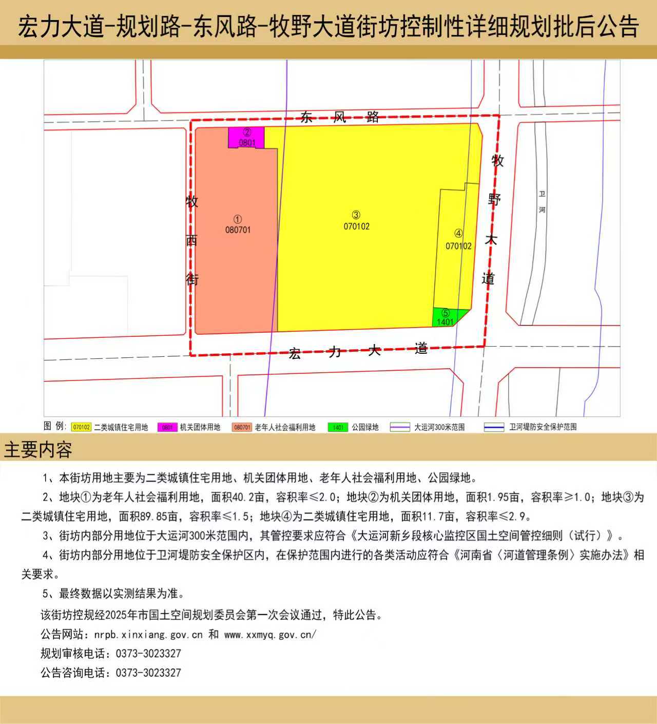3、街坊内部分用地位于大运河300米范围内,其管控要求应符合《大运河新乡段核心监控区国土空间管控细则(试行)》。